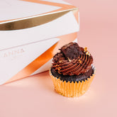 Each box contains Chocolate Fudge Brownie cupcakes; a rich chocolate sponge, filled with a decadent gooey ganache centre, topped with a chocolate buttercream swirl,a chocolate drizzle, a square of chocolate brownie and gold flecks.