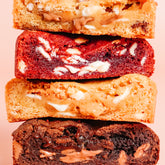 This box features our four festive, chunky cookies: Terry’s Choc Orange, Caramelised White Choc, Red Velvet, and the Salted Toffee Pretzel Crunch.