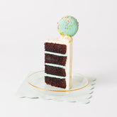 Our Gender Reveal Cake come with smooth white buttercream, and is filled with your choice of Blue or Pink buttercream sandwiched together with our light sponge and finished with buttercream piping, gold leaf and either a macaron halo or chocolate shards.
